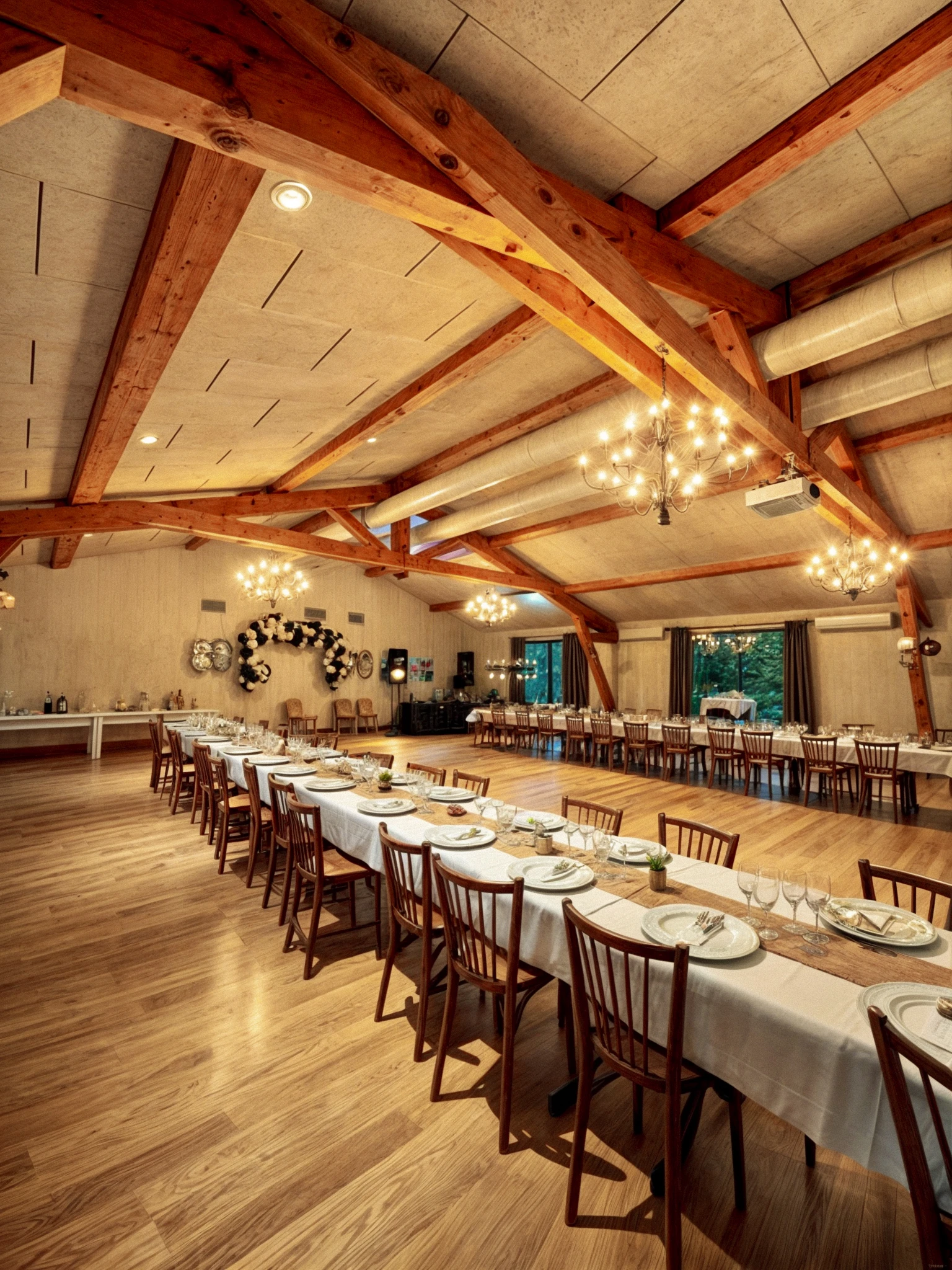 Cette salle majestueuse est le joyau des espaces de réception du Domaine. Avec ses larges baies vitrées, ce lieu baigné de lumière naturelle offre une atmosphère accueillante et chaleureuse. La charpente traditionnelle en bois et le parquet en chêne massif confèrent une ambiance élégante et authentique, idéale pour tous types de réceptions.