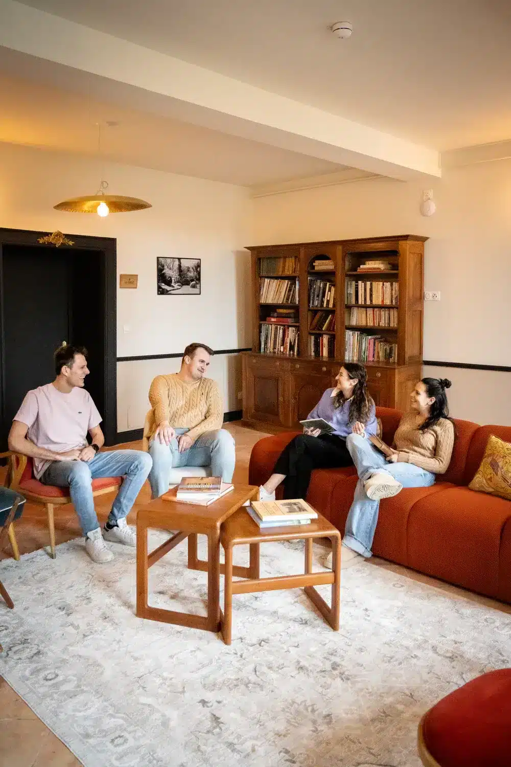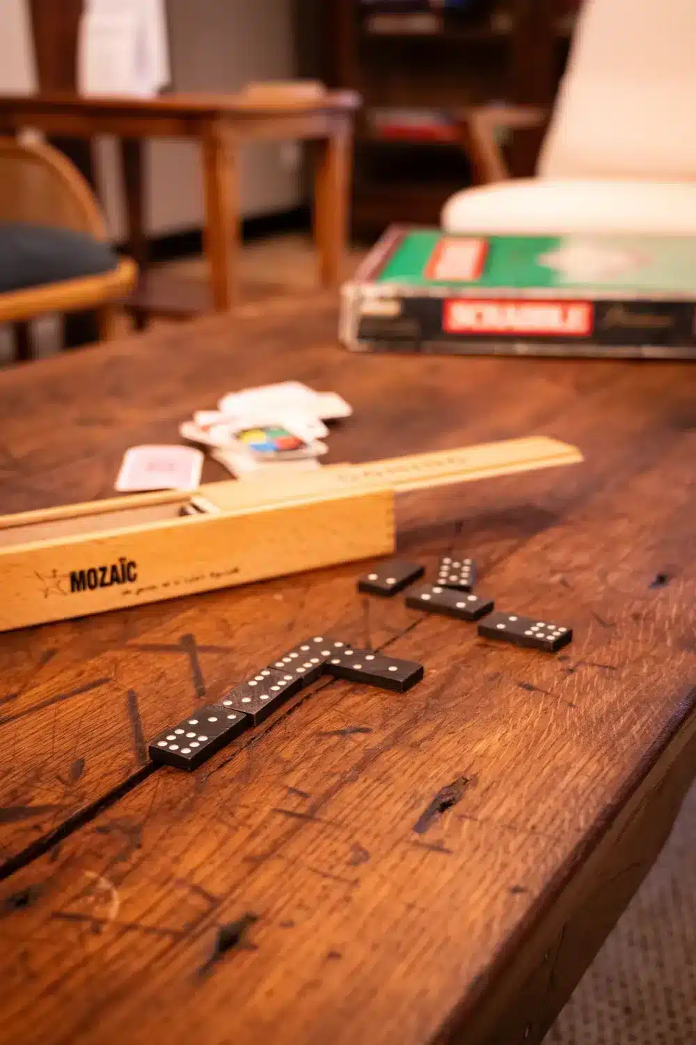 Le Salon Jeux de Société offre une ambiance intimiste, propice aux moments de détente ou de réflexion. Avec sa cheminée et son sol en tomettes historiques, il dégage un charme authentique. Les jeux de société présents mettent à l’honneur la région occitanie.