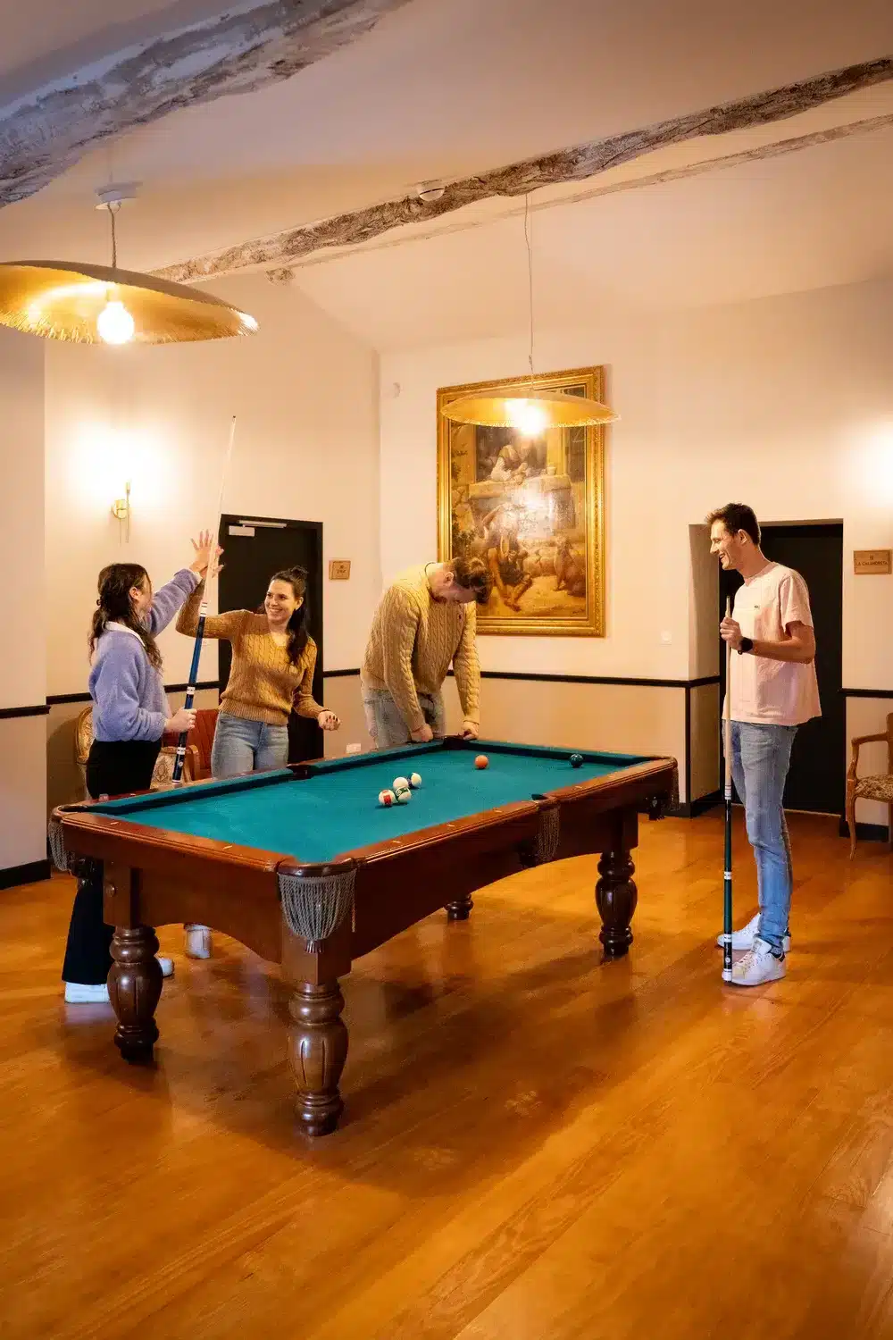 Le Salon Billard séduit par son sol en parquet massif et ses poutres apparentes, créant une atmosphère chaleureuse et conviviale. Sa table de billard invite à des moments de détente, ajoutant une touche ludique à vos événements.
